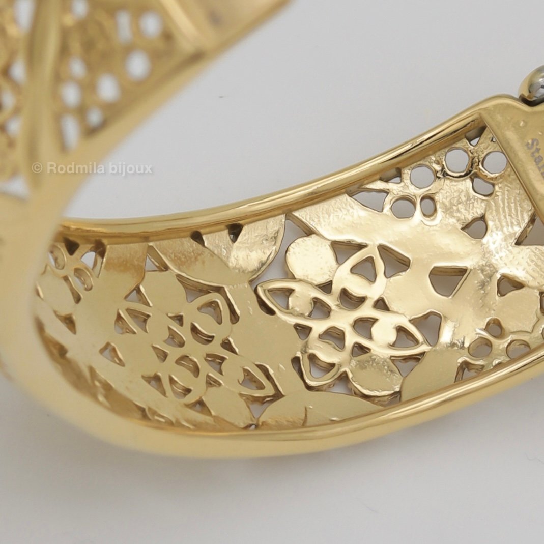 هذا السوار الأنيق مصنوع من فولاذ مقاوم للصدأ عالي الجودة، ومطلي بلون الذهب عيار 18 قيراط تمنحه لمسة فاخرة ولمعانًا يدوم طويلًا. يتميز بتصميم مفرغ بنقوش زهرية وهندسية متقنة، تجمع بين الطابع العصري والأصالة.