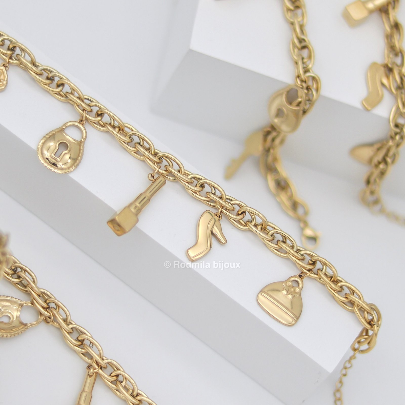 Ses 5 motifs « lifestyle » (clé, cadenas, rouge à lèvres, chaussure, sac) apportent du mouvement et de l’originalité à votre poignet.