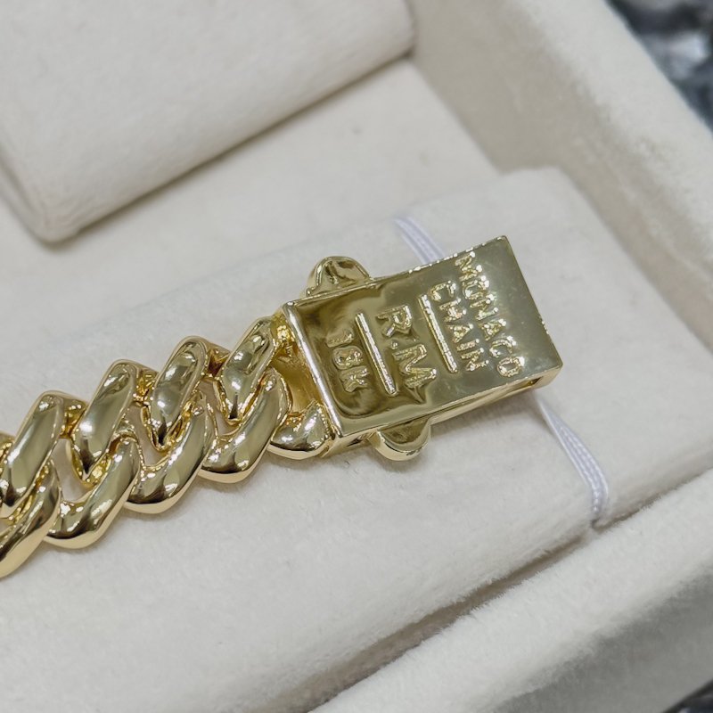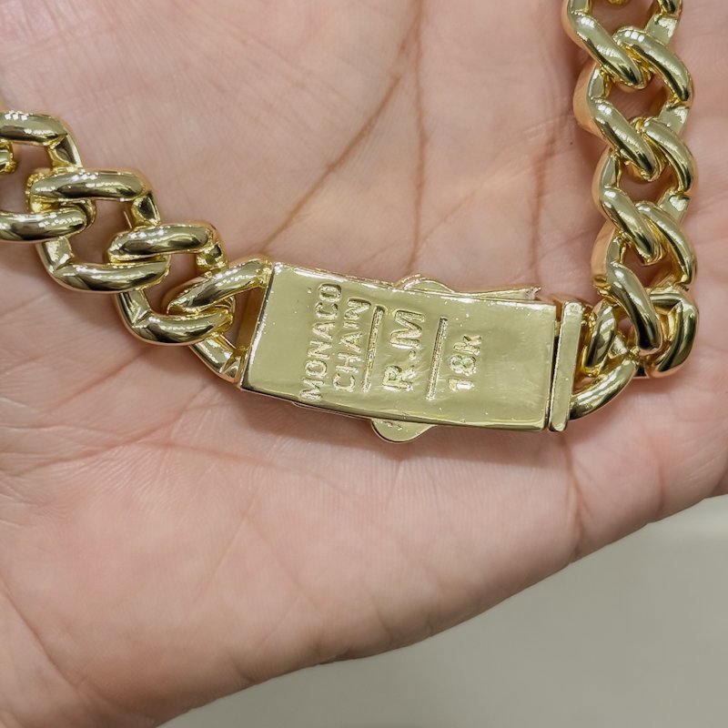 Chaque maillon est soigneusement poli et magnifiquement incrusté de zircons pavés qui offrent une brillance exceptionnelle, comparable à celle du diamant. Le fermoir rectangulaire, signé d’un motif “manco”, ajoute une touche de prestige et une identité moderne à l’ensemble.